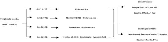 Prior to receiving the injection, subjects were recruited and subsequently allocated to one of the four treatment groups based on a pre-randomized treatment allocation table. Patients allocated to group 1 received 20 mg/2 mL (1 syringe) of intra-articular hyaluronic acid (HA) (Suplasyn, Mylan, Galway, Ireland) per week for three weeks; group 2 received a combination of intra-articular human umbilical cord-derived mesenchymal stem cells (hUC-MSCs) with HA in the first week and HA only for the subsequent two weeks; group 3 received a combination of 5.83 mg/1 mL (1 syringe) somatotropin (Saizen, Merck, Bari, Italy) with HA in the first two weeks and HA only in the last weeks; and group 4 received a combination of hUC-MSCs, HA, and somatotropin in the first week, HA and somatotropin in the second week, and HA only in the third week.