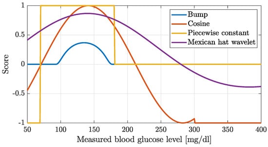 In our previous study [], we investigated which reward functions would give the best performance in terms of blood glucose regulation. For the first time, we examined continuous functions as well. One of the main challenges here was that we used an extended mathematical model, namely, the virtual patient model was completed by a stochastic sensor noise (continuous glucose monitoring sensor—also known as CGMS). We applied the model output: the noisy blood glucose level in the reward functions. Because of this, the deviations of the different reward functions were much larger, which made training extremely difficult, as violations of the termination criterion boundaries occurred more often due to the deviations. On the other hand, this procedure increased the viability of the methodology, since in practice, the CGM signal is available as input for control actions.