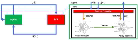 In our approach, the virtual patient is the IVP model, while the RL agent behaves as a closed-loop controller administrating insulin (to the environment). The IVP model provides the dynamic output of blood glucose (BG) levels (noisy BG level) depending on an array of inputs including both carbohydrates and insulin. The RL agent computes the insulin dosage for the upcoming time step (5 min) by integrating prevailing BG levels and the accumulated history of administered insulin. The resulting closed-loop design is shown in Figure 2 and detailed in Equations (1)–(4).