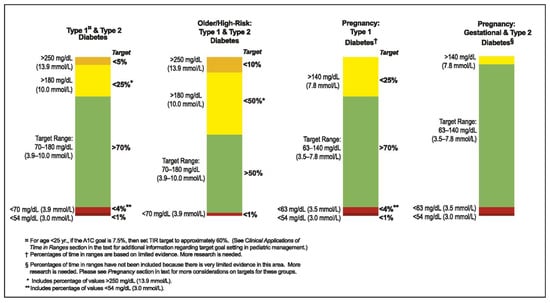 - Battelino, T.; Danne, T.; Bergenstal, R.M.; Amiel, S.A.; Beck, R.W.; Biester, T.; Bosi, E.; Buckingham, B.A.; Cefalu, W.T.; Close, K.L.; et al. Clinical Targets for Continuous Glucose Monitoring Data Interpretation: Recommendations From the International Consensus on Time in Range. Diabetes Care 2020, 43, 1593–1603. [Google Scholar] [CrossRef] [PubMed]