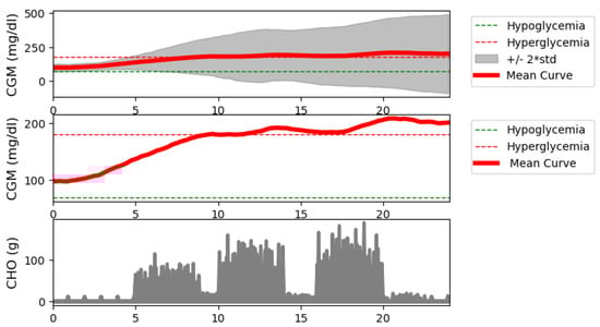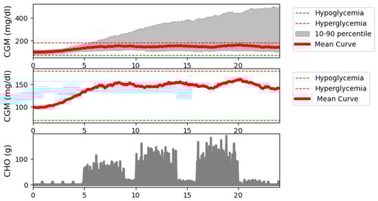 We utilized the meal generation schema of Wang et al. []. The algorithm generates six meals spread across the entire day, each having random carbohydrate content and timing.