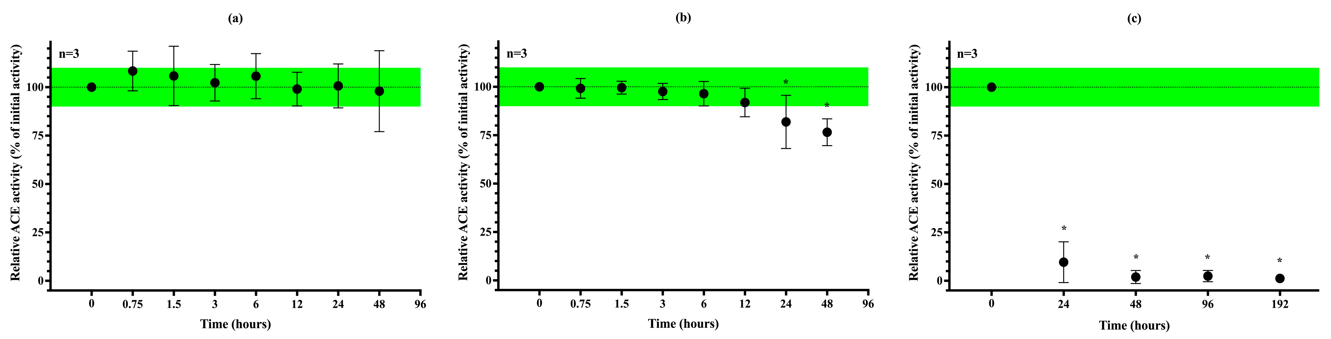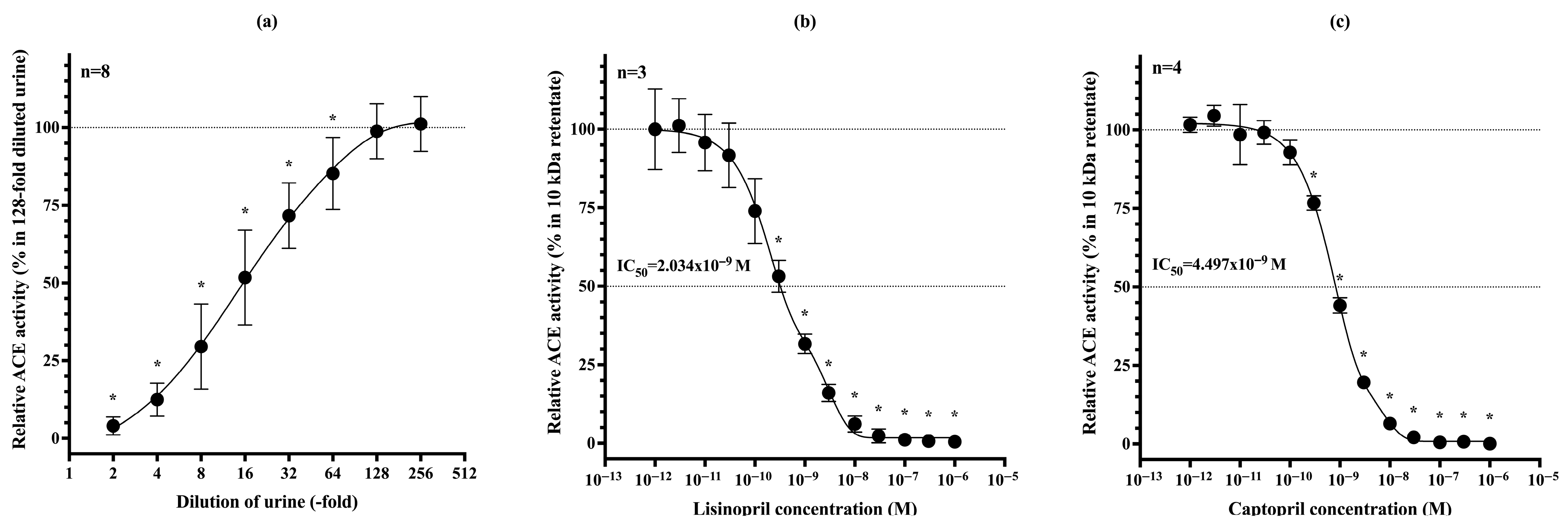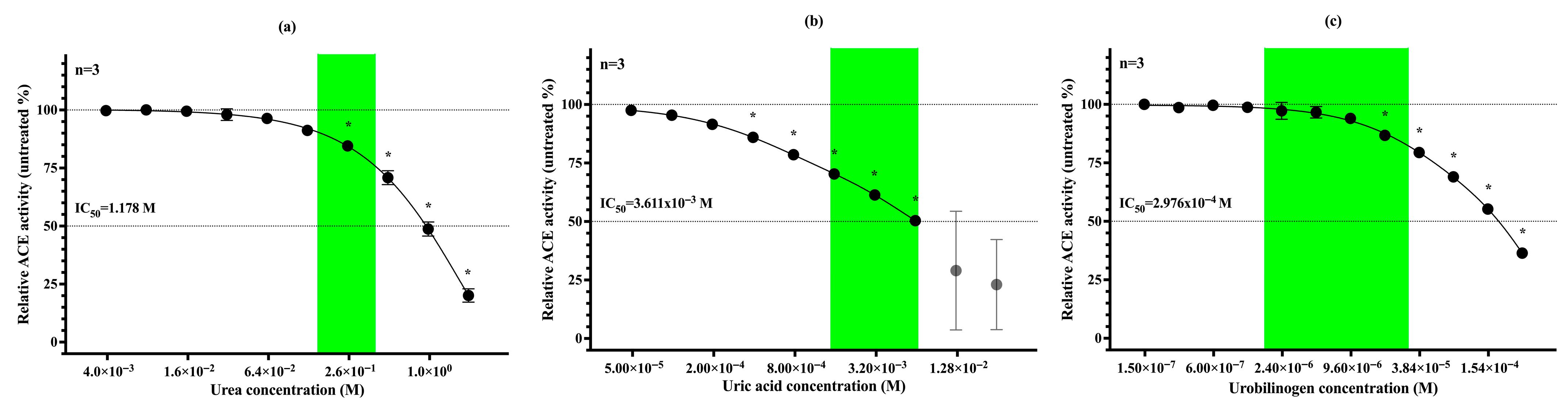 3.2. Dilutional Reversibility and Pharmacological Inhibition of uACE Activity