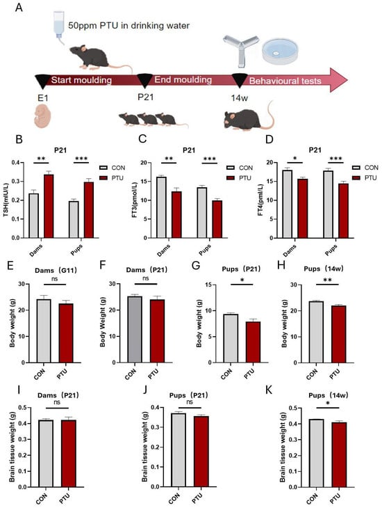 The establishment of an experimental model of developmental hypothyroidism and the identification of thyroid hormone levels. (A) Schematic illustrating the establishment of the experimental model of developmental hypothyroidism. Levels of TSH (B) and thyroid hormones FT3 (C) and FT4 (D) in the blood of postpartum dams at 21 days and pups at P21 following developmental exposure to PTU. Changes in body weight in pregnant mice at G11 (E) and postpartum dams at 21 days (F) following PTU exposure. Body weight of pups at P21 (G) and 14w (H) after developmental hypothyroidism. (I) Brain tissue weight of postpartum dams at 21 days. (J,K) Brain tissue weight of pups at P21 and 14w, respectively. n = 6. CON, control; PTU, developmental exposure to PTU; TSH, thyroid-stimulating hormone; FT4, free thyroxine; FT3, free triiodothyronine; P, postnatal day. Data are represented as mean ± SEM. ns: non-significant, * p < 0.05, ** p < 0.01, and *** p < 0.001 compared with the corresponding controls.