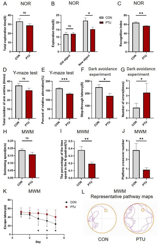 Cognitive and memory alterations in adult offspring mice with developmental hypothyroidism. The assessment of the novel object recognition (NOR) test in mice with developmental hypothyroidism, including total exploration time (A), exploration time for new and old objects (B), and the recognition index (C), were recorded. Note that the recognition index was lower in the PTU group than in CON. The total number of arm entry measurements (D) and the percent of relative alternations (E) in the Y-Maze. The test of step-through latency (F) and number of errors (G) in dark avoidance. The Morris Water Maze (MWM) test is associated with swimming speed (H), the percentage of time spent in the N quadrant (I), platform crossover number (J), escape latency (K), and representative pathway maps (L). Note that memory was impaired in developmental hypothyroidism mice exposed to PTU at 14w. CON, control; PTU, developmental exposure to PTU. n = 8; all data are reported as means ± SEM. ns: non-significant, * p < 0.05, ** p < 0.01, *** p < 0.001 compared with the corresponding controls.