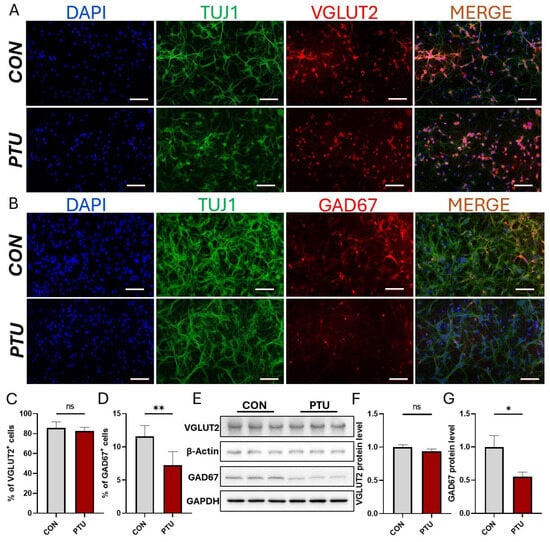 Effects of developmental hypothyroidism on hippocampal glutamatergic and GABAergic neuronal differentiation in vitro. (A) Immunofluorescence revealed expression of glutamatergic neuron marker VGLUT2 in primary hippocampal cells from CON and PTU mice. (B) Immunostaining for GABAergic neuron marker GAD67 in primary hippocampal cells of CON and PTU mice. (C,D) Quantitative assessment of the percentage of VGLUT2+ and GAD67+ cells in the CON and PTU groups, respectively. (E) Western blot analysis of VGLUT2 and GAD67 expression in primary hippocampal cells following developmental hypothyroidism. (F,G) Quantification of expression levels of VGLUT2 and GAD67 normalized to β-actin. n = 6. Data are presented as mean ± SEM of three independent experiments. Scale bars = 100 μm. ns: non-significant, * p < 0.05; ** p < 0.01.