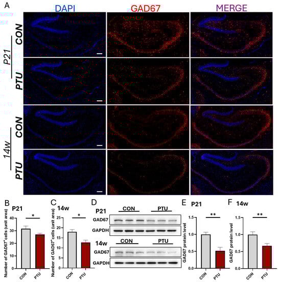 Changes in glutamatergic and GABAergic neurogenesis in adolescent and adult mouse hippocampal region following developmental hypothyroidism. (A) Representative images of immunostaining of GAD67 (red) in male mice at P21 and 14w following developmental hypothyroidism. (B,C) Quantification of GAD67-positive neurons in mice hippocampus at the ages of P21 and 14w, respectively. (D) Western blot analysis of GAD67 expression in mouse hippocampus at the ages of P21 and 14w following the developmental hypothyroidism, respectively. (E,F) Quantification of expression levels of GAD67 normalized to β-actin at the ages of P21 and 14w. Note that a similar reduction tendency in GAD67 protein expression was observed at P21 and 14w. n = 6. All data are presented as mean ± SEM. Scale bars: 200 μm. * p < 0.05; ** p < 0.01.