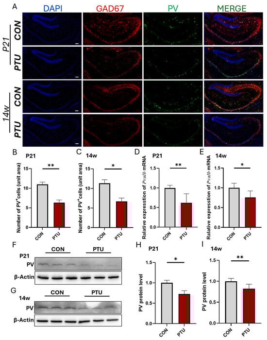 Changes in the neurogenesis of PV+ interneurons as a subtype of GABAergic neurons in juvenile and adult mouse hippocampus following developmental hypothyroidism. (A) Representative images of immunofluorescent double staining for GAD67 (red) and PV (green) in mouse hippocampus at P21 and 14w. Note that PV+ interneuron is the most abundant GABAergic neuron subtype. PV, parvalbumin. (B,C) Quantification of the number of PV-positive neurons. (D,E) Q-PCR revealed the changes in Pvalb at the transcriptional level in the PTU group compared to the CON group at P21 and 14w. (F,G) Western blot analysis of parvalbumin expression in the hippocampus under the indicated treatment. (H,I) Quantification of expression levels of parvalbumin normalized to β-actin. Data are represented as mean ± SEM of three independent experiments. Scale bar = 200 μm (A). * p < 0.05; ** p < 0.01 vs. their respective controls.