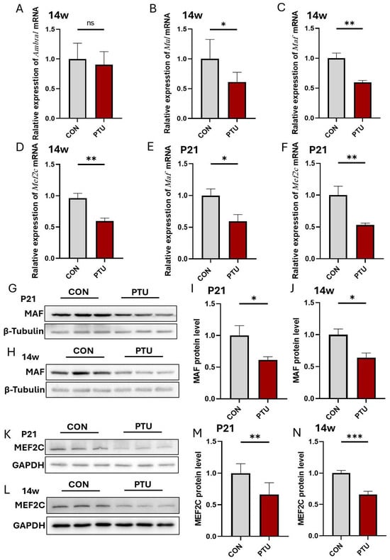 To further investigate the molecular mechanisms underlying the reduced PV+ interneurons resulting in cognitive and memory impairment in offspring, several genes associated with PV+ interneurons were identified through certain-scale screening of hippocampal tissues. The results showed no significant difference in the expression of the Ambra1 gene in the PTU group compared to the Con group at 14w (Figure 7A), but the Mul, Maf, and Mef2c genes appeared significantly downregulated at 14w in developmental hypothyroidism mice, especially the Maf and Mef2c genes (Figure 7B–D). Similarly, Q-PCR analysis also showed a significant downregulation of Maf and Mef2c mRNA in P21 mice with developmental hypothyroidism (Figure 7E,F). Western blot further validated the downregulation of Maf (Figure 7G–J) and Mef2c (Figure 7K–N) in developmental hypothyroidism mouse pups at P21 and 14w.