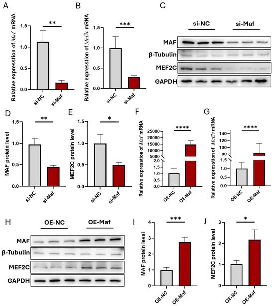 Given that Maf and Mafb regulate mouse interneuron fate specification and maturation, and Maf is likely to contribute to the regulation of Mef2c expression, we further investigated whether Maf can regulate Mef2c expression levels to strengthen the differentiation toward PV+ interneurons. As shown in Figure 8A, the mRNA level of Maf was significantly reduced when HT22 cells were transfected with Maf siRNA. Notably, Maf knockdown substantially decreased the mRNA level of Mef2c (Figure 8B). In addition, Maf knockdown caused a significant downregulation of Mef2c protein (Figure 8C–E). Conversely, an overexpression of Maf could lead to a marked increase in the expression of Mef2c (Figure 8F–J). These results imply that Maf is involved in the regulation of Mef2c expression and affects the determination of PV+ interneurons’ fate during development.