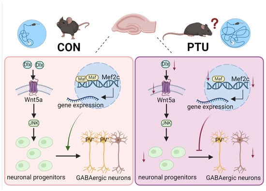 In the present study, we employed an integrative experimental approach combining a developmental hypothyroidism mouse model, an HT22 cell line, and primary neuron culture assays to comprehensively investigate the upstream–downstream relationship between Maf and Mef2c in neural differentiation of hippocampal PV+ interneurons under conditions of developmental hypothyroidism. To model hypothyroidism in vivo, pregnant mice were administered PTU, a well-established pharmacological inducer of hypothyroidism, enabling the investigation of TH function in nervous system development [,,]. Our findings indicate that developmental hypothyroidism can significantly reduce PV+ interneurons, which correlates with memory impairment. Mechanistically, this reduction is likely mediated, at least in part, by the downregulation of Maf and its downstream target Mef2c. This study could provide a foundation for further investigation of the molecular mechanism by which Maf regulates cognition and memory impairment induced by developmental hypothyroidism, while also identifying potential therapeutic targets for the treatment of this neurodevelopment disorder.