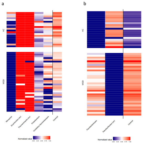 As expected, Firmicutes and Bacteroidetes were the most abundant phyla, accounting for about 90% of all bacteria in both groups. Based on the relative abundances generated by taxonomic analyses, the PELORA algorithm was used first to identify patterns of bacterial populations that best discriminate all patients with MDD from HC. The results are listed in Table 2 and graphically represented by the heatmap in Figure 2, showing slight variations at the phylum level, but more pronounced differences deeper in the taxonomic scale, with Paenibacillaceae detected in MDD but absent in HC and vice versa for the family of Flavobacteriaceaea, the genus Fenollaria, the species Flintibacter butyricus, Christensenella timonensis, Eisenbergiella massiliensis, Pseudoflavonifractor capillosus, Fenollaria timonenis, Robinsoniella sp. MCWD5 and Clostridum citroniae.