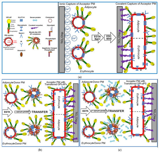 For set-up of an assay system reflecting the transfer of full-length GPI-APs between PM under defined conditions with regard to the type of the donor and acceptor cells, the incubation medium and any molecular entities affecting the transfer, a chip-based microfluidic sensor was established based on SAW. For this, the acceptor PM, derived either from primary rat adipocytes, human adipocytes differentiated from human adipose-derived stem cells (hADSC), or human erythrocytes, and harboring the GPI-APs acetylcholinesterase (AChE), tissue non-specific alkaline phosphatase (TNAP), 5’-nucleotidase (CD73), decay accelerating factor (CD55, DAF), and the complement membrane attack complex inhibitor (CD59), respectively, and in addition the transmembrane proteins, glucose transporter 4 and 1 (Glut4/1), insulin receptor (IR), Band-3, Glycophorin and Glut1, respectively in cell type-specific manner, were immobilized on the surface of TiO2 chips in course of a two-step capturing procedure (Figure 1a).