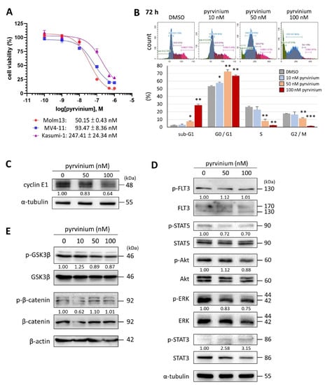 In vitro effect of pyrvinium pamoate on FLT3-ITD harboring Molm13 myeloid leukemia cells. (A) Half-maximal inhibitory concentration of pyrvinium after 72 h of treatment in Molm13, MV4-11, and Kasumi-1 cells, evaluated by MTS assay. (B) After exposure to pyrvinium for 72 h, the different populations of Molm13 cells were analyzed by flow cytometry using propidium iodide staining. * p < 0.05, ** p < 0.01, *** p < 0.001 vs. DMSO. (C) Immunoblot analysis of indicated proteins in Molm13 cells treated with DMSO, 50 nM pyrvinium, and 100 nM pyrvinium for 24 h and probed with anti-cyclin E1 antibody. (D) Immunoblot analysis of indicated proteins in Molm13 cells exposed to drugs for 4 h; or (E) probed with anti-p-GSK3β, GSK3β, p-β-catenin, and β-catenin antibodies. α-Tubulin was used as a loading control. Representative Western blots of three independent experiments are shown. Values represent the fold change with respect to the DMSO control group, after normalization with α-tubulin or β-actin.