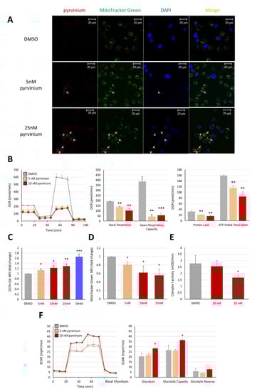 Mitochondria functions were impaired upon exposure to pyrvinium. (A) Confocal microscopy images showing that pyrvinium co-localized with mitochondria in Molm13 cells. Arrows indicate the mitochondria overlapped with pyrvinium. (B) Seahorse Cell Mito Stress Test was performed to measure basal respiratory, spare respiratory capacity, proton leak, and ATP-linked respiration in Molm13 cells treated with 5 nM, or 10 nM pyrvinium for 24 h compared to those in cells treated with DMSO. (C) Intracellular reactive oxygen species levels were measured by DCFH-DA staining; (D) Mitochondria mass was determined by MitoTracker Green staining coupled with flow cytometry in Molm13 cells treated with indicated concentrations of pyrvinium for 24 h. (E) Mitochondria respiratory chain complex I activity was measured after treatment with DMSO, 10 nM pyrvinium or 25 nM pyrvinium for 24 h. (F) Seahorse Glycolysis Stress Test was performed to measure basal glycolysis, glycolytic capacity, and glycolytic reserve after pyrvinium or DMSO treatment for 24 h. * p < 0.05, ** p < 0.01, *** p < 0.001 vs. DMSO.