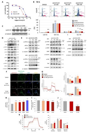 In vitro anti-leukemic effect of pyrvinium in Molm13-XR cells. (A) Half maximal inhibitory concentration of pyrvinium after treatment for 72 h, evaluated by the MTS assay in Molm13, and Molm13-XR cells. (B) Different populations of Molm13-XR cells upon exposure to pyrvinium for 72 h were evaluated by flow cytometry using propidium iodide staining. * p < 0.05, ** p < 0.01, *** p < 0.001 vs. DMSO. (C) Western blot analysis of Molm13-XR cells treated with DMSO, 50 nM pyrvinium, or 100 nM pyrvinium for 24 h and probed with an anti-cyclin E1 antibody. (D) Western blot analysis of indicated proteins in Molm13-XR cells exposed to drugs for 4 h. (E) Western blot analysis of Molm13-XR cell lysates probed with anti-p-eIF2α, eIF2α, and ATF4 antibodies for 6 h (E, upper left) or 24 h (E, lower left); or probed with anti-p-mTOR, mTOR, p-4EBP, 4EBP, p-S6K, S6K, p-GCN2, GCN2, p-PERK, PERK antibodies for 24 h (E, middle and right). α-Tubulin was used as a loading control. Representative Western blots of three independent experiments are shown. Values represent the fold change with respect to the DMSO control group after normalization with α-tubulin. (F) Confocal microscopy images demonstrating that pyrvinium was co-localized with mitochondria in Molm13-XR cells. Arrows indicate the mitochondria overlapped with pyrvinium. (G) Seahorse Cell Mito Stress Test was performed to measure basal respiratory, spare respiratory capacity, proton leak, and the ATP-linked respiratory in Molm13-XR cells treated with 5 nM, or 10 nM pyrvinium for 24 h, compared with those in cells treated with DMSO. (H) Intracellular reactive oxygen species levels were measured by DCFH-DA staining; (I) Mitochondria mass was determined by MitoTracker Green staining coupled with flow cytometry in Molm13-XR cells treated with indicated concentrations of pyrvinium for 24 h. (J) Mitochondria respiratory chain complex I activity was measured after treatment with DMSO, 10 nM pyrvinium or 25 nM pyrvinium for 24 h. (K) Seahorse Glycolysis Stress Test was performed to measure basal glycolysis, glycolytic capacity, and glycolytic reserve after pyrvinium or DMSO treatment for 24 h. * p < 0.05, ** p < 0.01, *** p < 0.001 vs. DMSO.