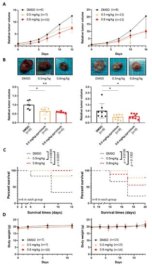 To determine the antitumor efficiency of pyrvinium in vivo, mice bearing Molm13 and Molm13-XR tumors were injected intraperitoneally with pyrvinium (0.5 or 0.8 mg/kg), six days a week. We found that the pyrvinium treatment retarded Molm13 (Figure 6A,B, left) and Molm13-XR (Figure 6A,B, right) tumor growth in a dose-dependent manner. Compared with the control group (DMSO), intraperitoneal administration of pyrvinium at a dose of 0.8 mg/kg could significantly prolong the survival time of mice inoculated with Molm13 and Molm13-XR tumors (Figure 6C). The drug was well-tolerated in mice and no effects on the body weight were observed during the dosing period (Figure 6D).