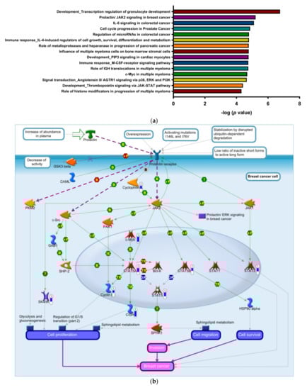 We used the MetaCore bioinformatics suite to analyze pathways enriched by the 1910 downregulated DEGs, and the top 15 pathways are shown in Figure 2a. Downregulated genes for the top 50 pathways are listed in Supplementary Table S2. The JAK/STAT pathway is crucial in transferring extracellular signals to cells and initiating gene expressions involved in cell proliferation, differentiation, survival, and developmental processes [68,69]. STAT3 and STAT5A/STAT5B are of particular interest because they are downstream effectors of tyrosine kinase oncogenes and contribute to the development of hematopoietic malignancies through both canonical and non-canonical pathways [6,69]. We found that STAT3 and STAT5 appeared in nine out of the top 15 enriched pathways. These included “Development_Transcription regulation of granulocyte development”, “Prolactin/JAK2 signaling in breast cancer”, “IL-6 signaling in colorectal cancer”, “Cell cycle progression in prostate cancer”, “Regulation of microRNAs in colorectal cancer”, “Immune response_IL-4-induced regulators of cell growth, survival, differentiation and metabolism”, “Immune response_M-CSF-receptor signaling pathway”, “c-Myc in multiple myeloma” and “Development_Thrombopoietin signaling via JAK-STAT pathway”.