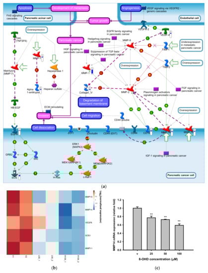 It was reported that BCR-ABL+ cells secrete angiogenic factors, such as MMPs and vascular endothelial growth factor (VEGF), and stimulate angiogenesis [76]. Figure 4a shows a MetaCore pathway map of “Role of metalloproteases and heparanase in progression of pancreatic cancer” in response to 48 h of 8-OHD treatment. The most significantly downregulated genes, including MMP14, MMP15, VEGFA, SOS1, and MMP11, in the microarray analysis are shown as a heatmap in Figure 4b, and were reconfirmed by RT-q-PCR as shown in Figure 4c–g.