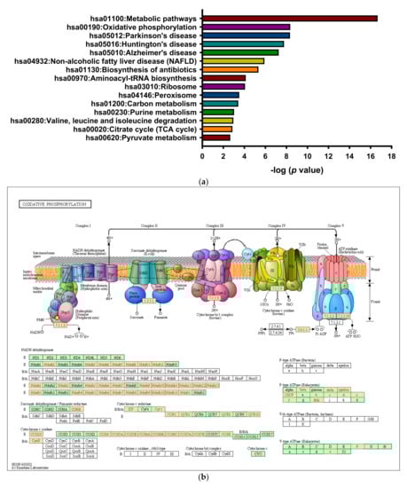 It is known that enrichment of DEGs by the multiple of change may discard many useful genes. We thus re-selected target genes commonly dose-dependently downregulated by 50 and 100 μM of 8-OHD using normalized data. An entire set of 5042 downregulated genes was selected and subjected to functional annotation and clusterization using the DAVID bioinformatics tools. The top KEGG pathways are shown in Figure 6a. It was found that “metabolic pathways” were the most significantly associated, followed by “oxidative phosphorylation” and three neurodegenerative diseases: Parkinson’s, Huntington’s, and Alzheimer’s diseases. These results agree with our finding in Figure 1c that “mitochondria” was the top GO term enriched by 8-OHD-downregulated DEGs (p = 1.81 × 10−33) (Supplementary Table S1).