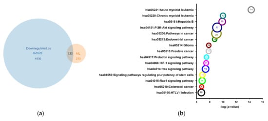 Genes associated with ML were collected from the DisGeNET database (http://www.disgenet.org/; accessed on 1 November 2021), which led to a collection of 385 pathological targets of ML (C0023470). Subsequently, the intersection of ML-associated genes and 8-OHD-downregulated 5042 genes was regarded as putative targets of 8-OHD against ML. As shown in Figure 8a, 112 genes were obtained in this manner. The top 15 KEGG pathways associated with these 112 targeted genes are shown in Figure 8b. Detailed information and downregulated genes involved in the top 25 KEGG pathways are shown in Supplementary Table S3. “Chronic myeloid leukemia” (hsa05220) and “PI3K-Akt signaling” (hsa04151) are the top 2 and 4 on the list and the 8-OHD-downregulated genes involved in these two pathways are indicated by red marks in Figure 8c,d. It was found that PI3K/AKT signaling and BCR-ABL-induced gene expressions of the SOS-RAC axis, STAT5, and MYC were downregulated by 8-OHD in the CML pathway (hsa05220) (Figure 8c). We previously reported that 8-OHD caused K562 cell-cycle arrest at the S phase by inhibiting p21Cip1 expression and upregulating CDK6 and cyclin D2 expressions [39]. The current data further demonstrated that the PI3K/AKT pathway is responsible for the upstream signaling of 8-OHD-induced cell cycle arrest (Figure 8d).