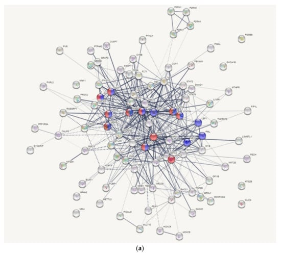 The Search Tool for the Retrieval of Interacting Proteins (STRING) database contains a huge number of protein–protein networks from 5090 organisms, 24.6 million proteins, and more than 2000 million interactions [63]. In the present study, we used the STRING database (v11.5) to analyze protein-protein interacting (PPI) networks [63]. A Markov clustering algorithm (MCL) with inflation factor = 2 was employed to find cluster structure in graphs by a mathematical bootstrapping procedure [64].