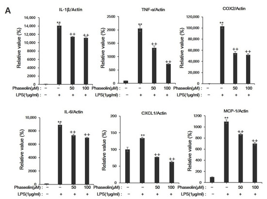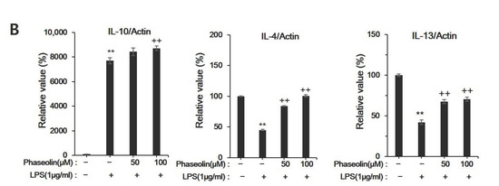 Effects of phaseolin on the mRNA expression levels of pro-inflammatory cytokines and other inflammation-related genes. Expression of (A) pro-inflammatory genes (such as interleukin (IL)-1β and tumor necrosis factor-α) and (B) anti-inflammatory mediators (such as IL-4, IL-10, and IL-13) at the mRNA level upon phaseolin treatment and LPS stimulation. The mRNA expression in the treated groups was normalized to that of in the negative control group (considered as 1) and is indicated as a relative value. ** p < 0.01, vehicle vs. LPS-treated group; + p < 0.05 and ++ p < 0.01, LPS vs. LPS + phaseolin-treated group. (C) Protein expression levels of pro-inflammatory genes (IL-6 and TNF-α) and an anti-inflammatory mediator (IL-10) upon phaseolin treatment and LPS stimulation. IL: interleukin.