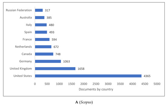 Figure 2A–C shows the top 10 producing countries for knowledge related to psycholinguistics. As can be seen, the top 10 countries all belong to the Western world except for Russia, which appears in three databases, along with China and Brazil in Lens. Even though these countries dominate the production of psycholinguistics research, contributions extend beyond this list to the countries after the top 10.