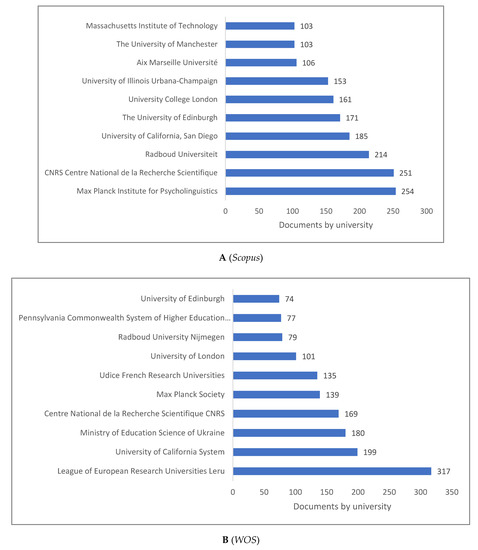 Figure 3A–C presents the top 10 universities and/or research centres producing knowledge in psycholinguistics. Most of these universities or research institutions are in Europe, with British universities having significant representation in all three databases. The Max Planck Institute of Psycholinguistics and Max Planck Society appear to have a high production level of knowledge related to psycholinguistics.