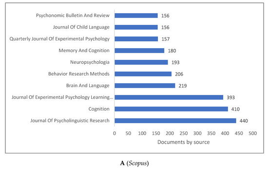 Figure 5A,B shows the list of top 10 publishers for knowledge in psycholinguistics. As Scopus does not include publisher information, these lists are limited to WOS and Lens databases. In terms of publishing research related to psycholinguistics, Springer Nature and Elsevier achieve the top two rankings in both databases.