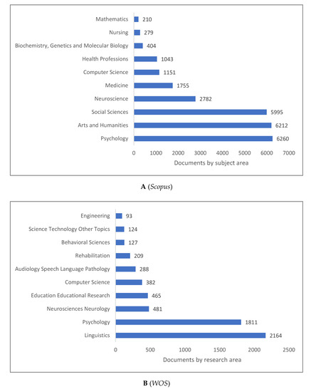 As the study of psycholinguistics progresses, many researchers have criticized the focus on monologues in empirical evidence rather than the sociocultural implications of dialogue-based evidence [30]. There has been an expansion of psycholinguistics to examine more specific aspects of human language, such as the production of language [31] and integrating the study of language with the cognitive sciences [32]. Recent reviews of psycholinguistics have focused on the use of offline measures of language comprehension [33], psycholinguistics and teaching and learning settings to enhance education [34], and the syntactic and cognitive aspects of language acquisition and learning [35]. Recent bibliometric analyses examined data from 1900 to 2021 concerning child language, which is the subject of psycholinguistic research. However, this review limited its data collection to articles and only used the WOS [36].