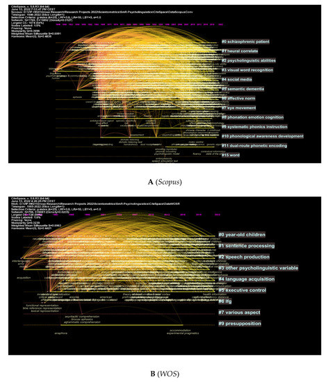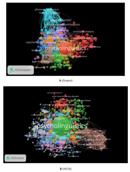 A scientometric indicator guides studies of this nature. A number of factors are taken into account (e.g., publications, citations and references, potential, etc.) as well as type indicators [43]. The most common method used in such studies is “mapping knowledge domains”, which refers to creating “an image that shows the development process and the structural relationship of scientific knowledge” and using maps that are “useful tools for tracking the frontiers of science and technology, facilitating knowledge management, and assisting scientific and technological decision-making” [44] (p. 6201). It is currently becoming more common for research of this type to include all fields of study without limiting itself to medical, health, and pure sciences [45]. This study examines psycholinguistics as a sub-field of linguistics that integrates psychology and linguistics.