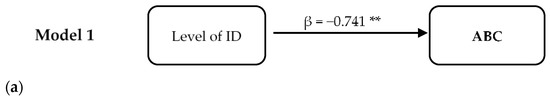 Hierarchical regression models for predicting ABC scores. Significant predictors were in four steps of regression: (a) Level of ID, (b) Level of ID and Gender of children, (c) Level of ID, Gender, and factors related to institutional care—Length of stay and Type of institutional care, (d) Level of ID, Gender, factors related to institutional care—Length of stay, Type of institutional care, and risk factors in development—Neonatal difficulties. * p < 0.05, ** p < 0.01.