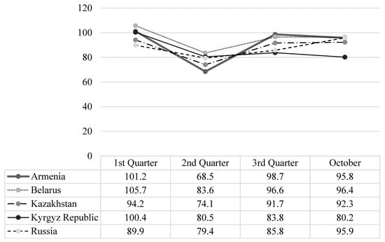 Furthermore, the new pandemic puts on trial not only individual countries but also interstate unions, especially those aiming to build a common market with free movement of goods, services, workforce, and capitals, in particular, a relatively young integration association—the Eurasian Economic Union (the EEU) of Armenia, Belarus, Kazakhstan, Kyrgyzstan, and Russia. It is rightly noted that the coronavirus pandemic that broke out in 2020 intensified the disintegration of the global economy (). According to some researchers, the impact of COVID-19 and the restrictive measures caused by the pandemic may serve as a trigger for triggering disintegration processes in the European Union (). Containing the spread of the coronavirus, as well as combating its consequences, has overshadowed all other goals, including to deepen integration in the Latin American region ().