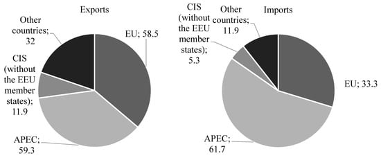 The structure of foreign trade in the EEU member states for January–June 2021 is shown in Figure 2 and Figure 3.
