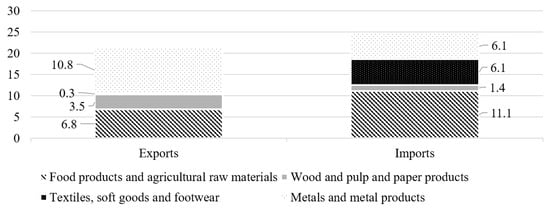 - Textiles, soft goods, and footwear, occupying 0.3% in the structure of exports and 6.1% in the structure of imports;