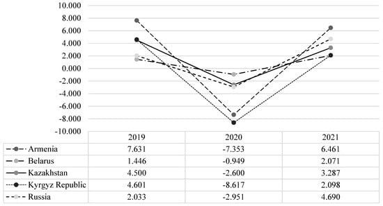 To estimate the magnitude of COVID-19 in the EEU member states, we considered the change in GDP (economic growth rate) in 2019–2021 (Figure 4).