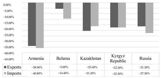 Hence, the change in the volume of international trade occurred in the EEU member states in percentage terms in 2020 in the age of the COVID-19 pandemic and crisis just as in other economic unions. The decrease in exports turned out to be more significant than the decrease in imports, but the trend of a decrease in the volume of international trade in the EEU member states, just as in the majority of other economic unions considered above, was caused by foreign economic policy launched as early as in 2019 or before that (for example, in 2018 in EU 28) rather than by the COVID-19 pandemic and crisis.