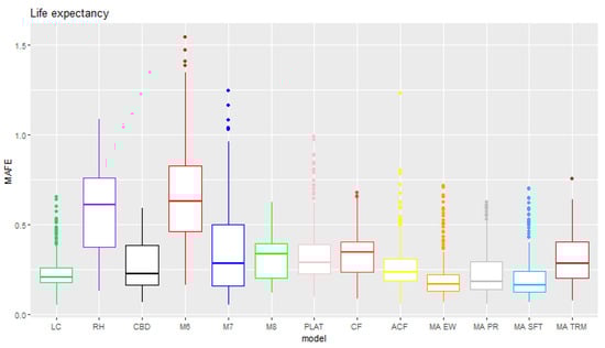 Observing Figure 3, we can generally say that the best results, in terms of MAFE, are given by the model-averaging approaches based on equal and proportional weights and on the softmax function. They all present a median MAFE lower than 0.4 and 0.006, respectively, for life expectancy and the Gini index. The RH model is the third-best model (after model-averaging approaches with equal weights and with weights based on the softmax function) for life expectancy (but with weak performance for the Gini index), while the PLAT model is the best for the Gini index (but has weak performance for life expectancy). The model-averaging approach based on trimming has good overall performance as well. Indeed, it is overcome in terms of median MAFE only by the RH model for life expectancy and the PLAT model for the Gini index. Among the other models, good results are given by the CBD model regarding life expectancy and by the CF model for the Gini index. The worst results here are found in the M7 model for life expectancy and the M6 and M8 models for the Gini index. Other models, such as LC and ACF, do not show remarkable results.