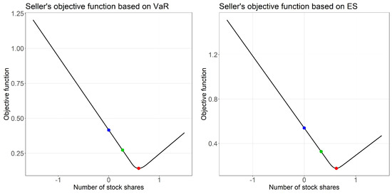 To provide more intuition on the shape of the seller’s good-deal bound based on VaR in Figure 3, in Figure 4 we plot the objective function from the optimization problem of the seller using VaR as preference criterion, that is, we plot the function . Each plot corresponds to a specific stock price . We see that the minimum for rising stock prices goes hand in hand with a rising number of stock shares. For the stock prices of and there are one local and one global minimum. For increasing stock prices in the interval the stock position belonging to the global minimum changes in a discontinuous manner, because at some stock price local and global minima change their roles. This is the reason for the kink of the seller good-deal bound in Figure 3.