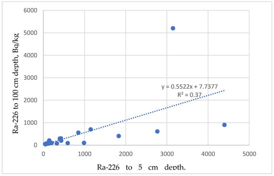 - r(Ra-226_5, Ra-226_100) = 0.6083 shows a positive correlation between bot variables. The regression line shows that concentrations at 5 cm depth are greater than at 100 cm. This is consistent with vertical migration of Ra-226, but the bigger fraction remains at 5 cm depth (Figure 2).