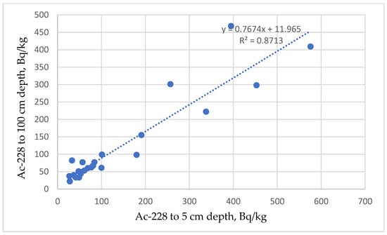 - r(Ac-228_5, Ac-228_100) = 0.9334 shows a strong positive correlation. The regression line shows that concentrations at 5 cm depth are slightly bigger than at 100 cm. This is consistent with vertical migration of Ac-228, but the fraction at 5 cm depth is slightly bigger (Figure 3).