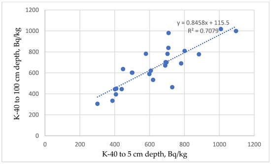 - r(K-40_5, K-40_100) = 0,8414, shows a strong positive correlation. The regression line shows that K-40 concentration at 5 cm and 100 cm depth are very similar. This is consistent with the conservative abundance of K in nature (Figure 4).