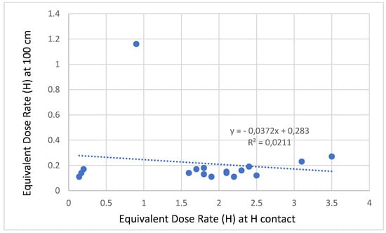 We also analyzed the correlation for the Equivalent Dose Rate (H) data series (at contact and 100 cm) (Figure 5):