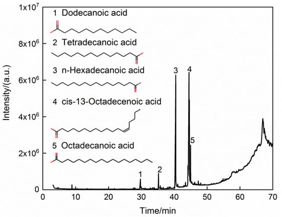 Figure 7 shows GC/MS chromatograms of volatile products from oil sludge pyrolysis at 393–844 K and 844–1173 K. Comparing the MS spectrum with the NIST database, the main organic compounds with a relative content of more than 0.1% (area %) in the volatile products are listed in Table S1 and their classification in Table 9. Figure 5a shows that the aliphatic hydrocarbons had the high intensity, followed by fatty acids, such as n-hexadecanoic acid and dodecanoic acid. According to Table 7, the organics in the volatile products mainly consist of aliphatic hydrocarbons (C3–C15), fatty acids such as n-hexadecanoic acid and dodecanoic acid, ketones, esters, and nitrogen compounds at 393–844 K, at relative contents of 37.133%, 11.684%, 11.327%, 7.346%, and 9.028%, respectively. These compounds could be mainly formed by cleavage of C=C, C-O, and C-H bonds in most fatty acids and by volatilization of the low-molecular-weight components of aliphatic hydrocarbons and nitrogen compounds in the cold-rolling oily sludge. Furthermore, at 844–1173 K, there were fewer species of organic compounds detectable by GC-MS, mainly propene, benzene, toluene, and a small amount of nitrogen compounds, and the relative contents of aliphatic hydrocarbons, monocyclic aromatic hydrocarbons, and nitrogen compounds were 49.780%, 36.594%, and 5.431%, respectively. At high temperatures, the C=O bonds in the high-molecular-weight components of esters and fatty acids were broken to form aliphatic hydrocarbons and CO. At the same time, the Fe3O4 in the solid phase was reduced to Fe by CO. In addition, nitrogenous benzenes were pyrolyzed to form monocyclic aromatic hydrocarbons and nitrogen compounds. Yu et al. [] found that Fe can promote the cleavage of phenol and nitrogen-containing compounds, so the cleavage of nitrogenous benzenes was promoted by Fe in the solid phase. In view of the volatile products, since the aliphatic hydrocarbons and monocyclic aromatic hydrocarbons are usually gaseous at room temperature and do not contain PAHs, they can be used as basic raw materials for petrochemicals and fuels. The fatty acids and esters could act as surfactants.