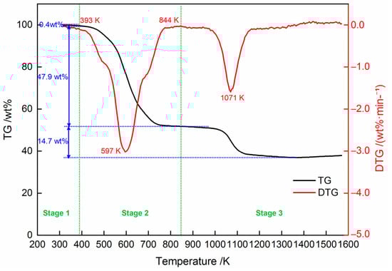 Figure 4 shows the thermogravimetry (TG) and differential thermogravimetry (DTG) curves of the dried cold-rolling oily sludge at the heating rate of 10 K/min in a helium atmosphere. As shown in Figure 4, there were three stages during the decomposition process of the sludge between 293 K and 1573 K. Figure 5 shows the FTIR spectra of the evolved volatile gas products from pyrolysis at 393 K, 597 K, and 1071 K. Table 5 illustrates the infrared absorption peaks of major gaseous products [,]. In the initial stage at the temperature below 393 K, TG and DTG curves declined slightly, with about 0.4 wt % weight loss. The FTIR spectra of gas products at 393 K (Figure 5a) display obvious absorption bands at 4000–3500 cm−1 and 2000–1250 cm−1, attributed to the O–H bonds of the water. The absorption bands at 2400–2250 cm−1 and 667 cm−1 can be attributed to CO2. This suggests that H2O and CO2 were released from the cold-rolling oily sludge in stage 1 pyrolysis, likely due to the drying and gas desorption []. During the second stage, in the temperature range from 393 K to 844 K, the TG curve dropped rapidly, resulting in the largest weight loss peak shown by the DTG curve (3.02 wt %·min−1) at 597 K. The total weight loss of stage 2 pyrolysis was approximately 47.9 wt %. The FTIR spectra of volatile gas products at 597 K (Figure 5b) show an absorption band of C-H bonds at 3000–2800 cm−1, implying the release of alkyl groups along with the absorption bands of H2O and CO2. At the same time, the C=O bond at around 1780–1640 cm−1 reveals the possible presence of esters, carboxylic acids, and ketones []. The low-molecular-weight components in the cold-rolling oily sludge could thermally decompose and volatilize. In the last stage (stage 3), at temperatures above 844 K, the weight loss during was 14.7 wt %, with a weight loss rate of 1.83 wt %·min−1 at 1071 K. As seen from Figure 5c, the IR peaks of CO at 2181 and 2109 cm−1 and C-H bonds at 3000–2800 cm−1 were observed in the volatile gas from the sludge at 1071 K, suggesting that heavy carbonaceous substances in the residues of the cold-rolling oily sludge cracked to form CO and alkyl groups at a high temperature. In addition, the IR peaks of CO2 at 2400–2250 cm−1 and 667 cm−1 indicate that the iron oxide in the solid phase could be reduced by the CO to form CO2 [].