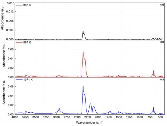 FTIR spectra of volatile gas products from the cold-rolling oily sludge pyrolysis at different temperatures: (a) 393 K; (b) 597 K; (c) 1071 K.