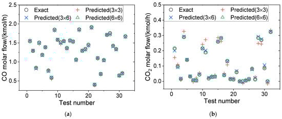 From the results in Figure 8, it can be seen that in most cases, the predicted products of BRM can reflect the variation of the exact value. Similar with the previous part, the prediction accuracy is related to the neuron number in the hidden layers, though the range is wider. More neurons can increase the prediction accuracy, making the deviation lower. It is obvious that in these cases, the prediction error in case 3 is the largest and the error increases with the decrease in neuron number. For example, the exact value of CO molar flow is 0.906 kmol/h, while the predicted values are 1.714 kmol/h, 1.234 kmol/h and 1.029 kmol/h when the neuron numbers are (3 × 3), (3 × 6) and (6 × 6), respectively. The predicted products of other gases also show the same trend. This is due to the reason that the condition of case 3 seriously deviates from the condition variation range of the training sample. However, the properly high number of neurons is beneficial to the prediction accuracy. Results in this part demonstrate that the trained ANN models demonstrate sufficient prediction performance, whereas the condition range is wider to some extent.