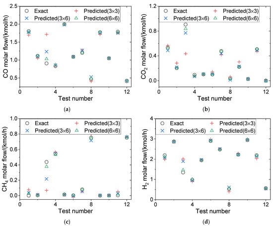 It can be seen that because the operating condition is randomly selected, the results also distribute randomly in these cases. The CO molar flow in the gaseous product varies from 0.400 to 1.915 kmol/h. For the prediction of its value, three ANN models show satisfactory accuracy. The predicted values using these models agree well with the exact values. For CO2 in the gaseous products, its molar flow varies from 0 to 0.322 kmol/h. As exhibited in Figure 6b, the predicted values in some cases deviate from the exact values with certain errors. It is clear that the deviation range using the ANN model of (3 × 3) is larger than the deviation range using the model of (6 × 6), demonstrating the higher accuracy of ANN models with more neurons. This can also be clearly demonstrated by the prediction results of H2O molar flow in Figure 6e. Additionally, the predicted values of H2 and CH4 molar flows can reflect the exact ones, except a few cases using the ANN model with hidden layer neuron numbers of (6 × 6). Based on these results, the prediction errors are obtained, as illustrated in Figure 7.