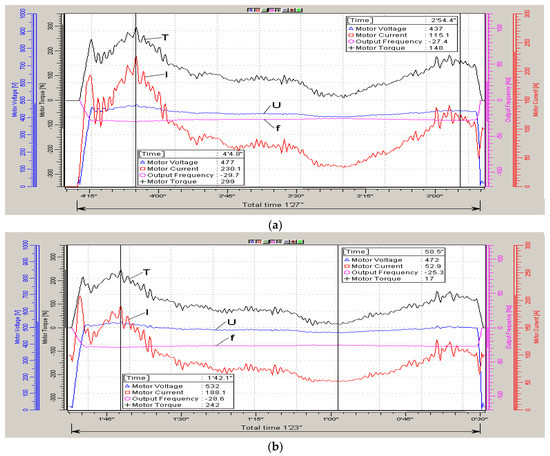 In this case, the stator current (I), frequency (f) and stator voltage amplitude (U) of the electric motor were recorded. The main parameter was the U/f ratio (determining the main magnetic flux in the motor and further denoted by the conventional units “Fl”) for three speeds: low (0.5 m/s), medium (1.5 m/s) and high (2.5 m/s).