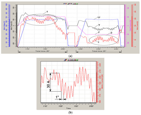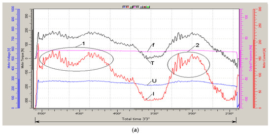 The above-mentioned traditional methods of analysis of asynchronous electric drives, the so-called Park’s equations [1,2,3,4], turned out to be useless for the analysis of these results. Vector equations in principle are compiled for constant frequencies and loads [5,6,7], and for variables they become rather conditional and inaccurate. In modern research on AC drives, there are areas devoted to solving the problems of sensorless control [9,10,11,12,13,14] or optimization processes mainly in terms of energy consumption [15,16,17,18,19]. Much attention is also paid to the problems of current oscillations [20,21,22,23,24]. With regard to electric motors based on oscillations, methods for identifying various types of faults were built [20,21,22]. However, the work on optimizing the control of drives with a varying load should be noted [1,23,24], including the change in the flux through the U/f ratio, but in them the authors do not investigate the very cause of the occurrence of the stator current oscillations, but the drive load is considered to be the cause of low-frequency components. As a result of the review, it should be noted that the studies do not illuminate the features noted above and do not allow the finding of answers to the questions posed.